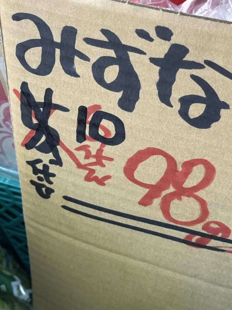 生憎、水菜ちゃん、間に合っていますので、買いませんでしたが、外で売ってる八百屋さん(スーパーと違って冷房がない🥵)お野菜が外気で萎れてしまいますからね、売っちゃいたいのでしょうが、それにしても、もはや水菜のお値段じゃないですね🫨