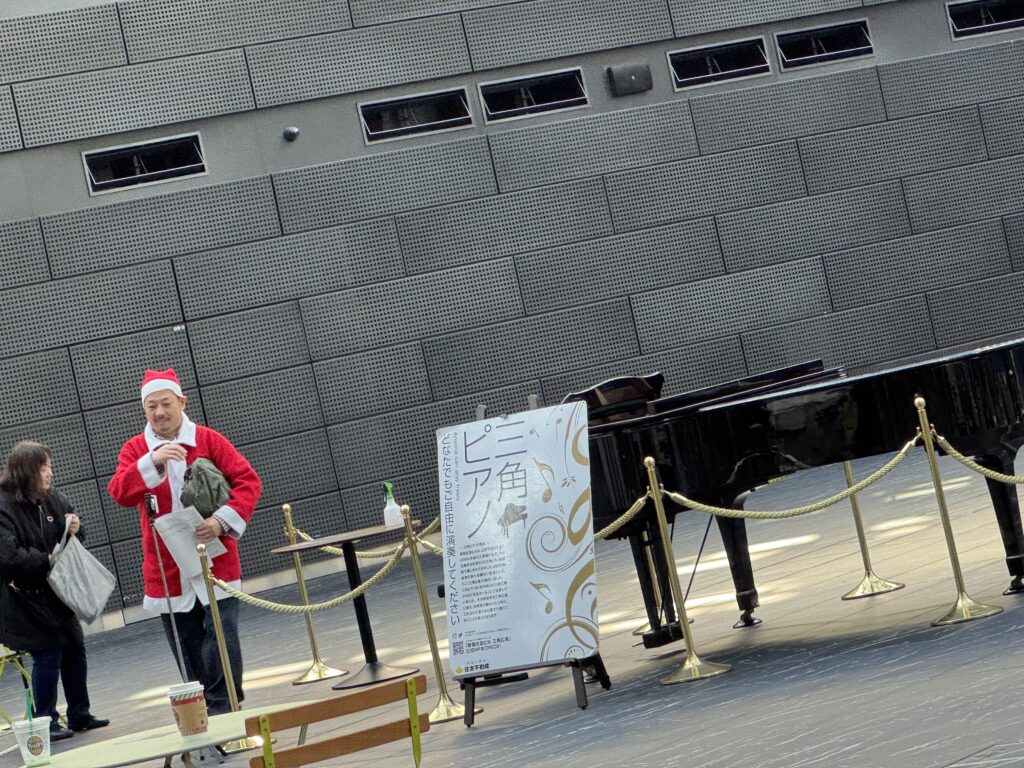 住友ビルの三角地帯には、ストリートピアノが設置されていて、クリスマスソングが次々と流れてくるのでした🎅