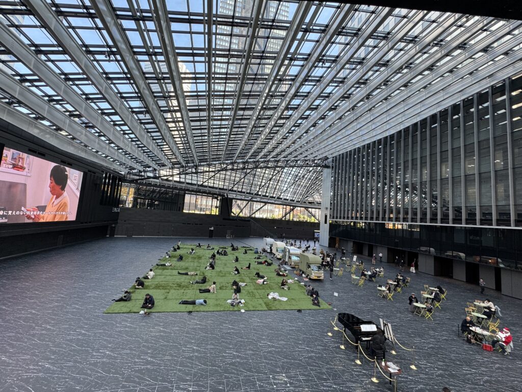 人口芝生のような敷物の上に、ゴロンゴロンと寝そべっている人々‥