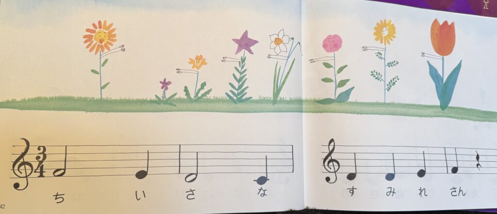 スミレは一番小さくて一番前だから、腕が横、お花がだんだん高くなっている!