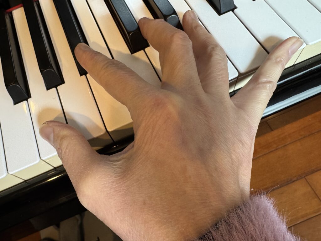 届かない和音があって、こうやって斜めにしないと弾けない部分がある